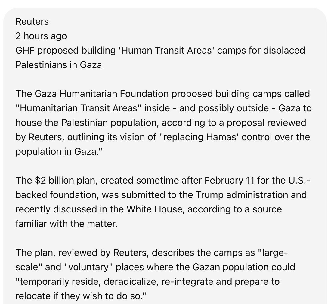 كشفت وكالة رويترز، الإثنين، عن وثيقة حصلت عليها تُظهر أن مؤسسة “غزة الإنسانية” (GHF)، وهي جهة مدعومة من الولايات المتحدة، عرضت مقترحًا يقضي بإنشاء ما سمته “مناطق عبور إنسانية” داخل قطاع غزة وربما خارجه، لإيواء الفلسطينيين النازحين، في خطة وُصفت بأنها تسعى لـ”استبدال سيطرة حماس على السكان”.