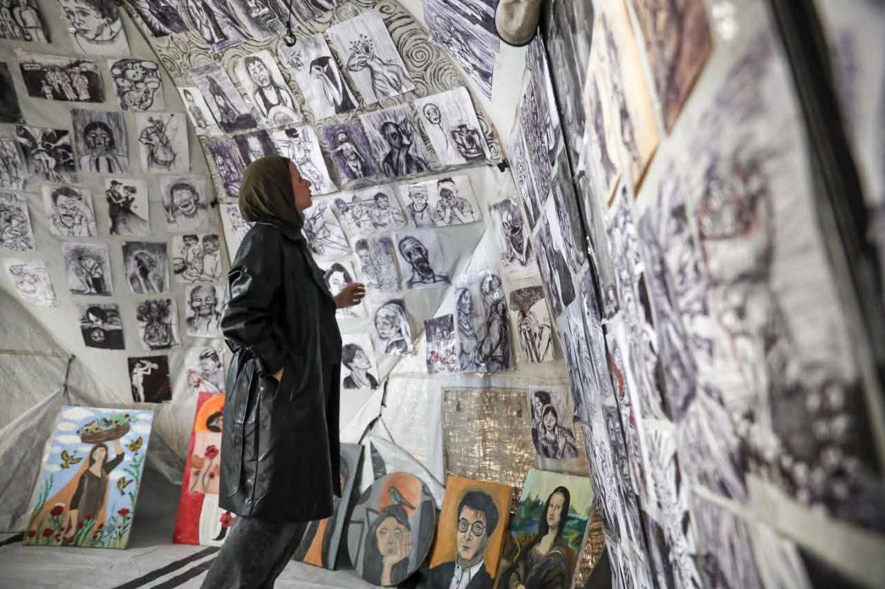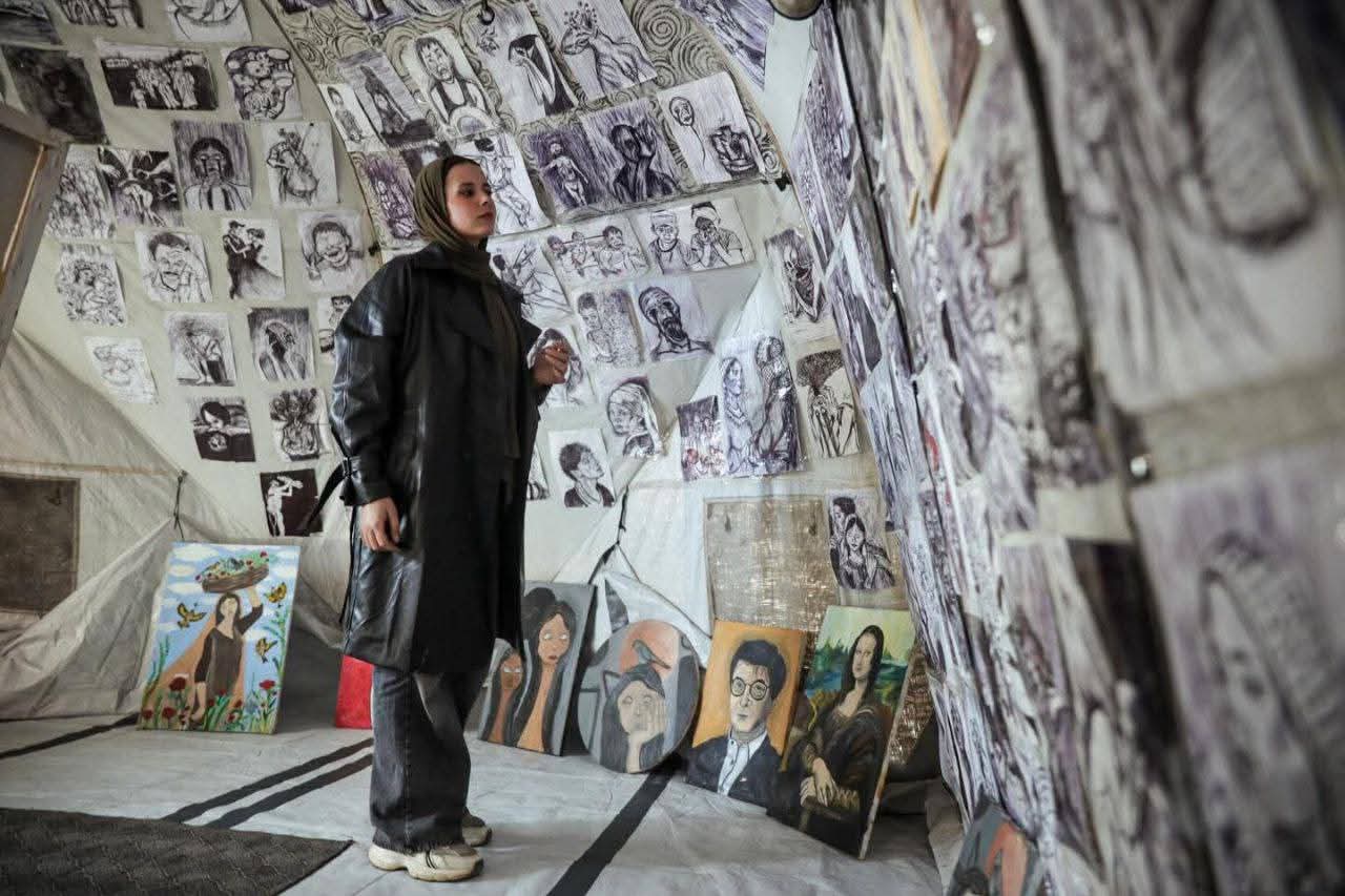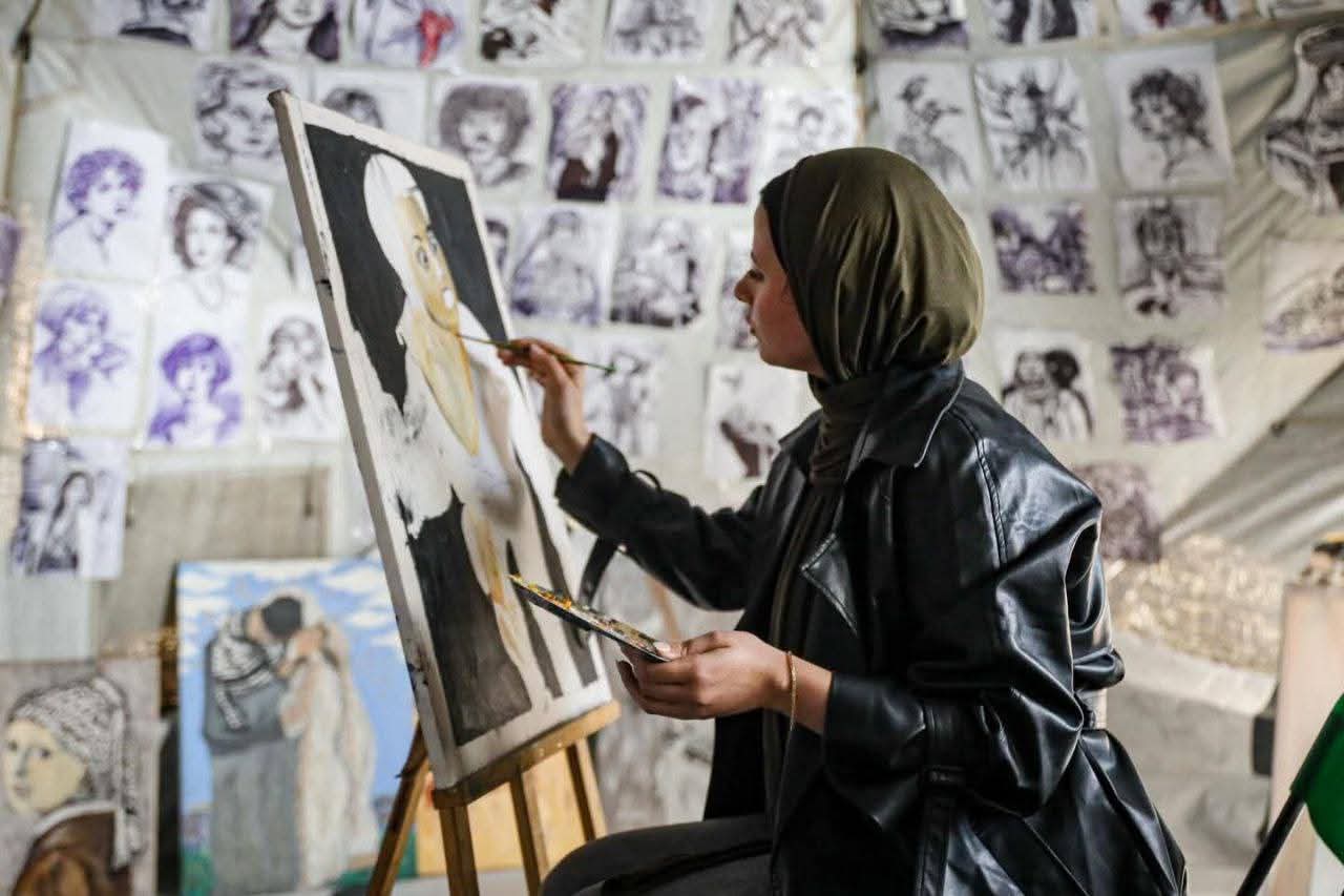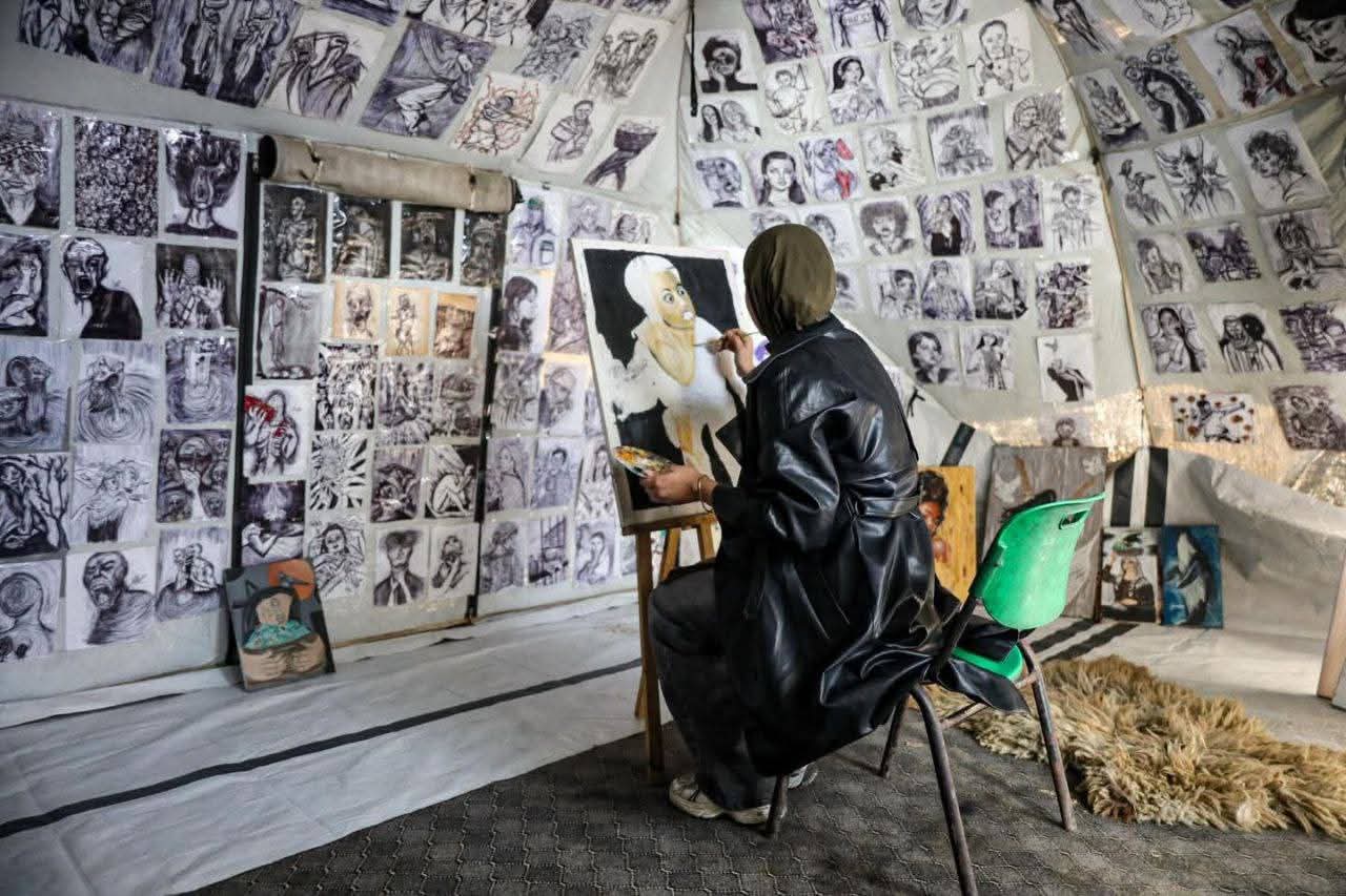 الشابة مرح الزعانين، البالغة من العمر 18 عامًا، تزيّن خيمتها الفنية في مدرسة الرمال شمال قطاع غزة، بعد أن أجبرها النزوح على مغادرة منزلها.