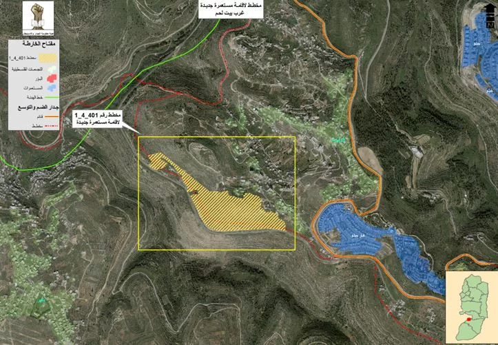 وأضاف، أن هذا الامر قد تكرر أيضاً في محافظة بيت لحم، وتحديداً في حزيران من العام 2022، عندما تم طرح مخطط هيكلي جديد للإيداع من أجل توسعة مستعمرة هار غيلو المقامة على أراضي المواطنين في محافظة بيت لحم، وحمل المخطط حينها الرقم 1\4\401 وكان يهدف لبناء 952 وحدة استعمارية جديدة، ليتبين أن دولة الاحتلال تخفي نية لبناء مستعمرة جديدة تحت اسم “كارميل” ستقوم بعزل بلدتي الولجة وبيتير في محافظة بيت لحم.