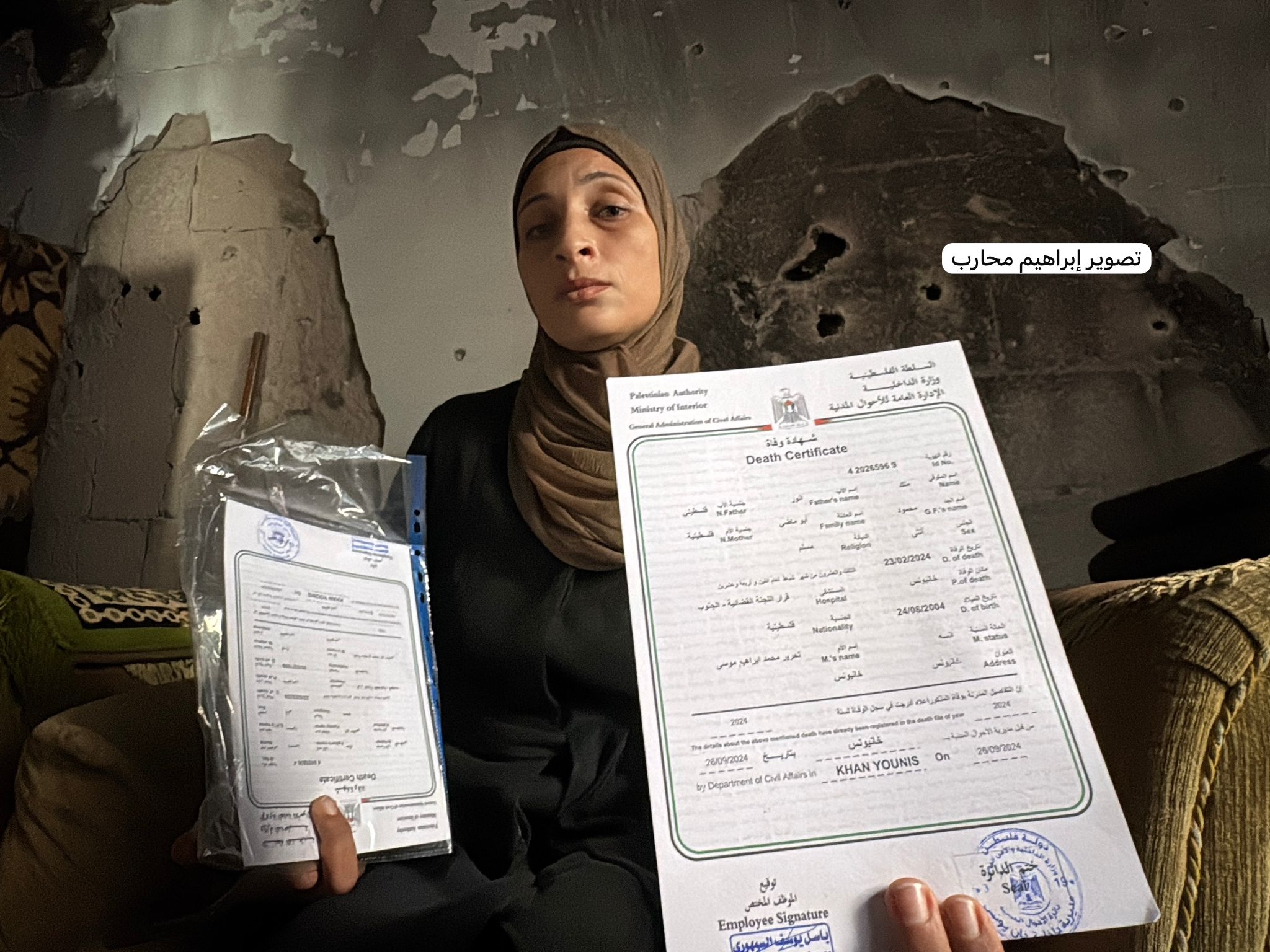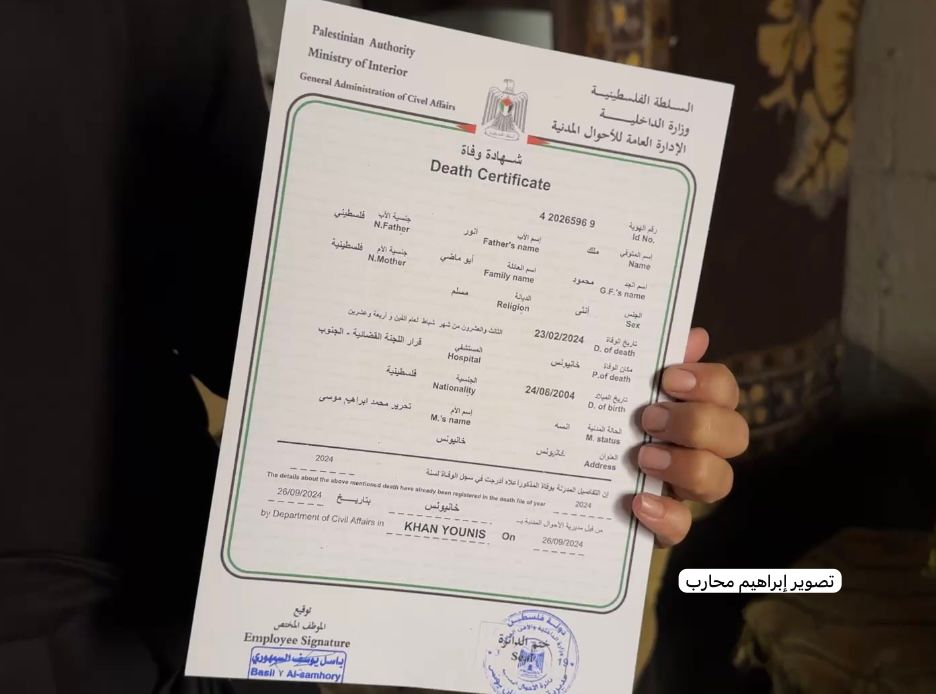 بعد أيام، أُصدرت شهادة وفاة رسمية باسم ملك أبو ماضي، دون تمكين العائلة من رؤية الجثمان أو التحقق من ظروف استشهادها. هكذا دخلت الأسرة في حداد قاسٍ، محمّل بالأسئلة والوجع، دون إجابات.