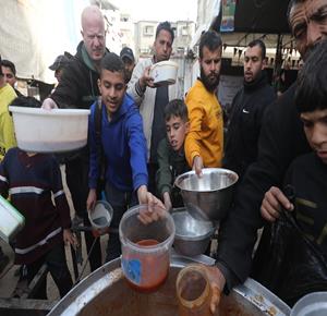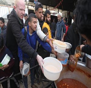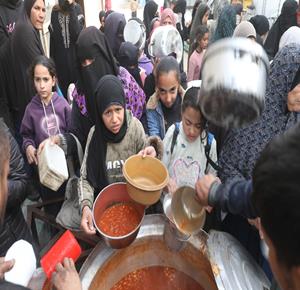 نازحون يتجمعون لتلقي وجبات طعام من مطبخ خيري قبيل موعد الإفطار في مخيم النصيرات، وسط قطاع غزة