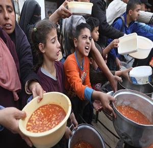 نازحون يتجمعون لتلقي وجبات طعام من مطبخ خيري قبيل موعد الإفطار في مخيم النصيرات، وسط قطاع غزة.