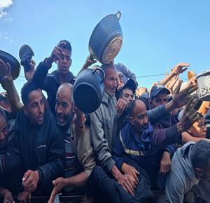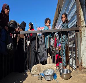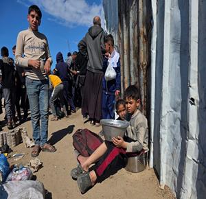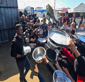 نازحون يتجمعون للحصول على وجبات طعام من مطبخ خيري في خان يونس جنوب قطاع غزة.