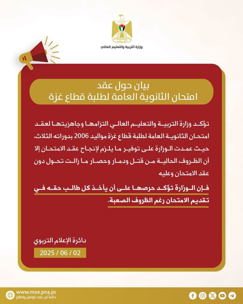 وشددت الوزارة على حرصها الكامل على ضمان حق كل طالب وطالبة في تقديم الامتحانات، مؤكدة أنها تبذل أقصى الجهود الممكنة لتأمين هذا الحق المشروع رغم المصاعب الكبيرة التي تواجهها المنظومة التعليمية في القطاع.