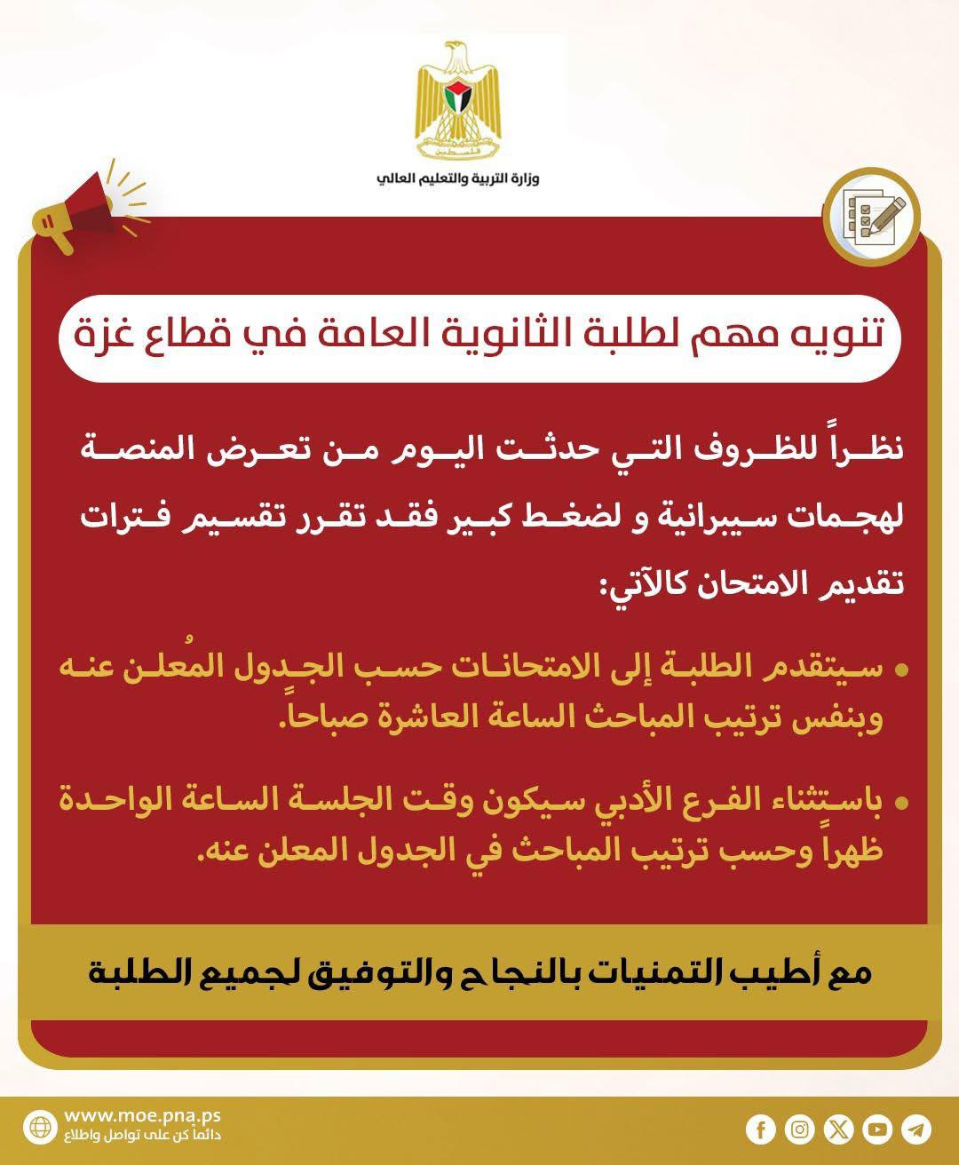 وزارة التربية والتعليم: تعديل مواعيد امتحانات الثانوية بغزة بعد هجمات سيبرانية على المنصة