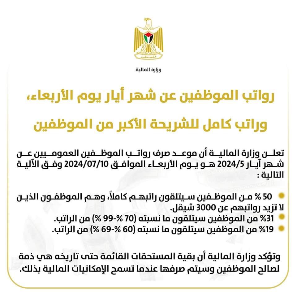 أعلنت وزارة المالية الفلسطينية عن صرف رواتب الموظفين العموميين عن شهر أيار – 2024 م يوم الأربعاء المقبل وذلك على النحو التالي: