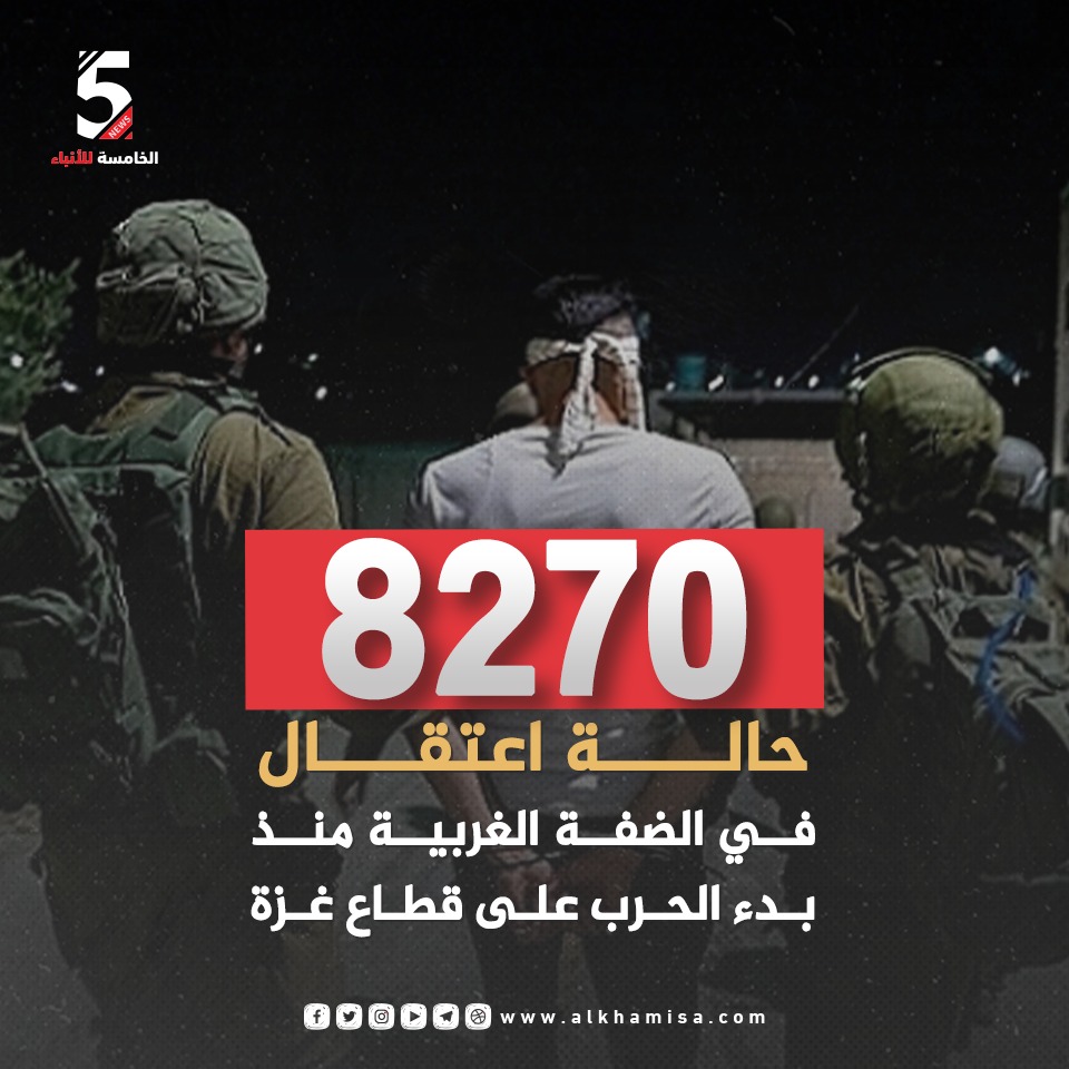 وبلغت حصيلة الاعتقالات منذ بدء معركة “طوفان الأقصى” في السابع من تشرين الأول/أكتوبر 2023، أكثر من 8270، وهذه الحصيلة تشمل من جرى اعتقالهم من المنازل، وعبر الحواجز العسكرية، ومن اضطروا لتسليم أنفسهم تحت الضغط، ومن احتجزوا كرهائن.