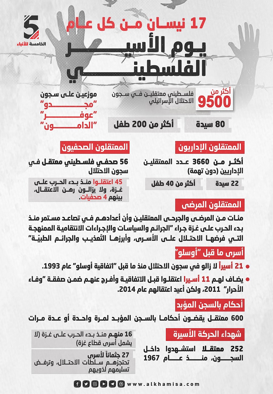يُحيي أبناء شعبنا الفلسطيني، في الوطن والشتات يوم الأسير الفلسطيني، في السابع عشر من نيسان/ أبريل من كل عام، بعد أن اعتمد هذا اليوم المجلس الوطني الفلسطيني عام 1974 يومًا وطنيًا من أجل حرية الأسرى، وتوحيد الجهود والفعاليات لنصرتهم، ودعم حقّهم المشروع في الحرية.