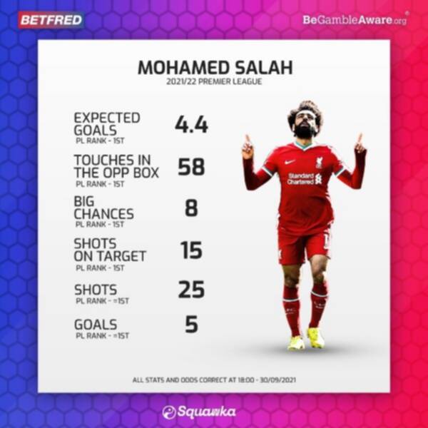 ووفقًا لشبكة “سكواوكا” للإحصاءات، فإن صلاح سيطر على الصدارة في إحصاءات اللاعبين بالبريميرليج هذا الموسم، حيث إنه أكثر من أحرز أهدافا (5)، وأكثر من سدد (25).