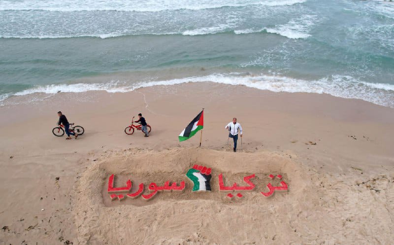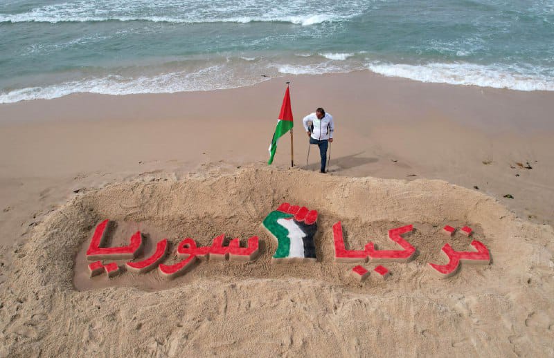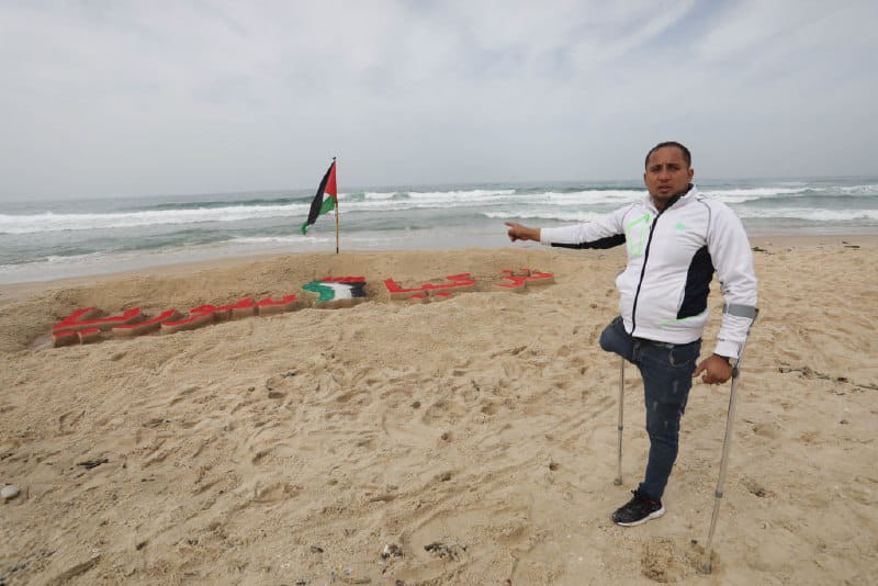📷 الجريح محمد طوطح يتضامن مع ضحايا الزلزال في سوريا وتركيا على شواطئ قطاع غزة