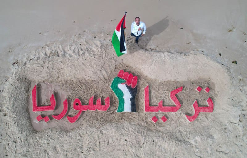 بالصور.. الجريح محمد طوطح، يتضامن مع ضحايا الزلزال، في سوريا، وتركيا، على شواطئ قطاع غزة.