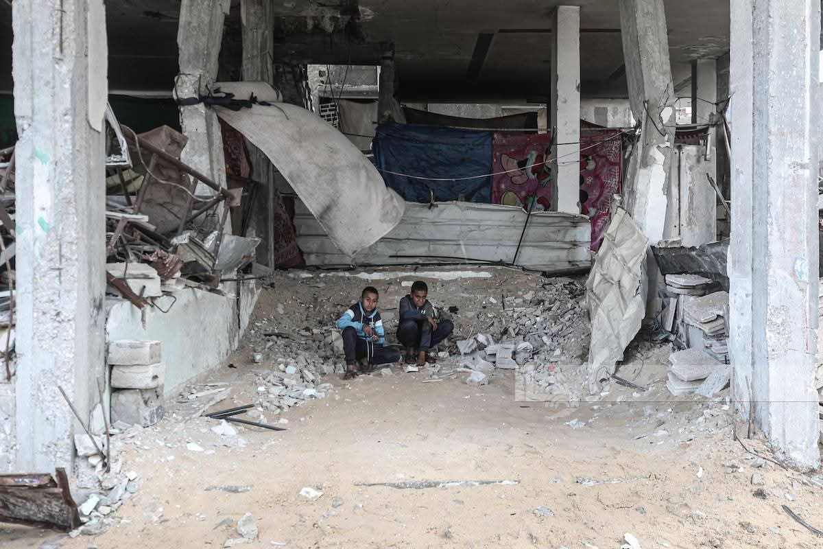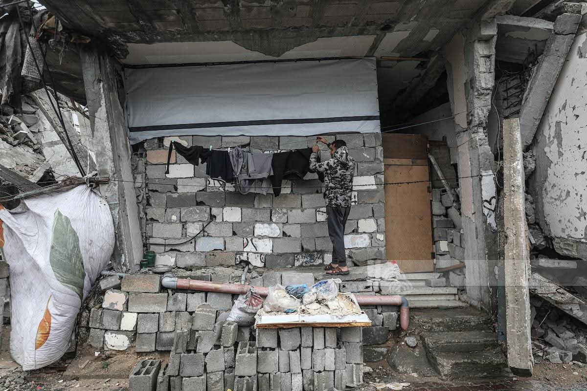 📸 عائلة نازحة تحت أنقاض بناية مدمرة في مخيم البريج وسط المنخفض الجوي