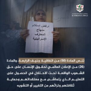 ودعا التيار كافة النشطاء والمغردين الفلسطينيين والعرب للتدوين على هاشتاق #لا_لأسرلة_التعليم، للتأكيد على حق الشعب الفلسطيني الواقع تحت الاحتلال في الحصول على التعليم الذي يتماشى مع معتقداته وحماية ثقافته وتراثه من التغيير أو التشويه.