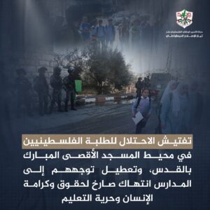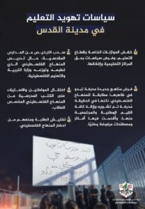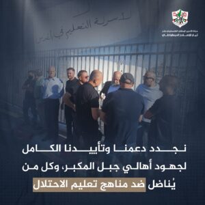ويذكر أنه منذ أيام يعم إضراب وغضب واسع في بلدة “جبل المكبّر”، بعد افتتاح وزارة معارف الاحتلال عدة مدارس بنظام التعليم الإسرائيلي، ضمن محاولات مستمرة في استهداف التعليم بالقدس، و إجراءات عنصرية يتبعها الاحتلال تتمثل في تحريف المنهاج الفلسطيني، والتهديدات بسحب التراخيص ومنع الميزانيات، بالإضافة للتنغيص على الطلبة وتفتيشهم.