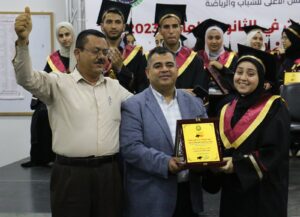 كرم عبد السلام هنية مساعد أمين عام المجلس الأعلى للشباب والرياضة، أوائل فلسطين في الثانوية العام 2023، في مجمع فلسطين الرياضي.