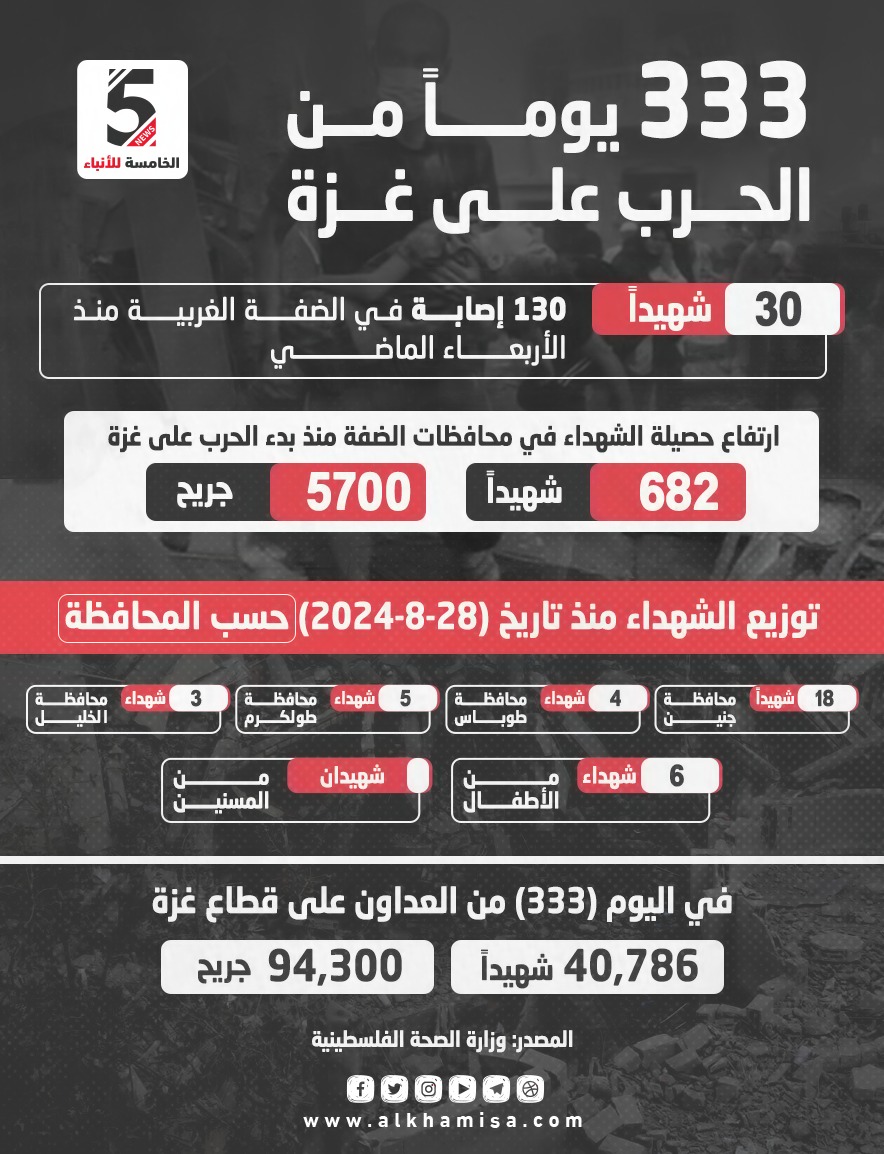 الرئيسية/انفو جرافيك الخامسة/333 يوم من الحرب على غزة انفو جرافيك الخامسةطوفان الأقصى 333 يوم من الحرب على غزة3 سبتمبر، 2024 شبكة الخامسة للأنباء - غزة الوسوم#احصائية #حرب_غزة #طوفان_الأقصى جرحى شهداء نسخ الرابط تم نسخ الرابط 3 سبتمبر، 2024 شاركها فيسبوك X ماسنجر ماسنجر واتساب تيلقرام طباعة