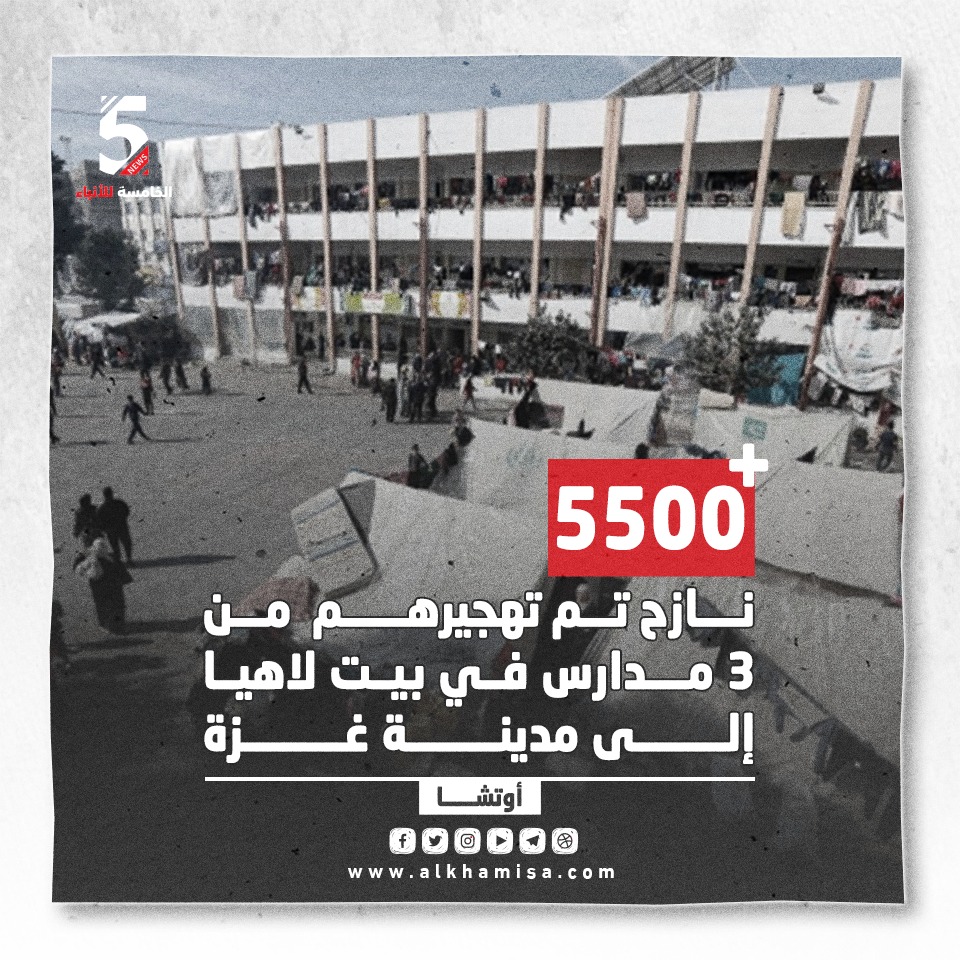 5500 نازح تم تهجيرهم من 3 مدارس في بيت لاهيا إلى مدينة غزة