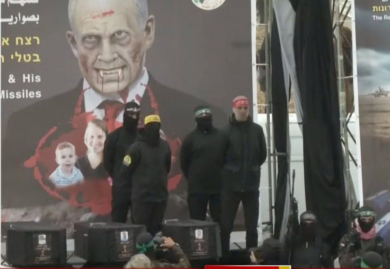 أظهرت المقاومة صورة رئيس وزراء الاحتلال بنيامين نتنياهو على شكل مصاص دماء، في المنصة الرئيسية للتسليم، وأرفقتها بعبارة “قتلهم مجرم الحرب نتنياهو بصواريخ الطائرات الحربية”.
