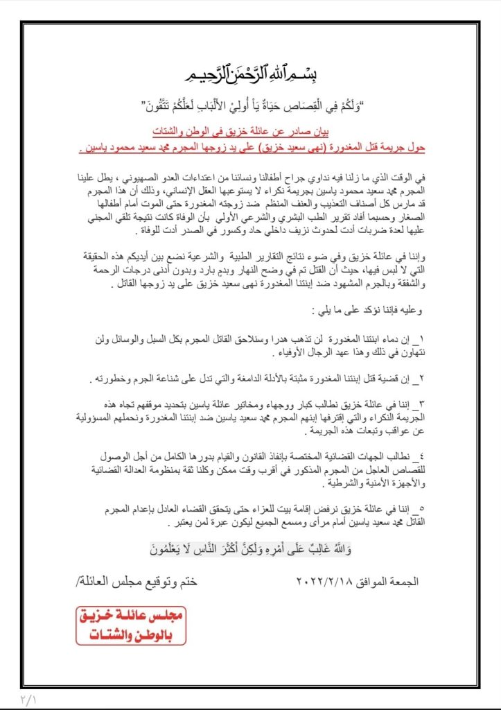 نشرت عائلة خزيق، أمس الجمعة، بياناً للرأي العام بعد جريمة مقتل ابنتها نهى جراء الاعتداء عليها من قبل زوجها “م.ي”، مُشيرةً إلى أنّها لن تُقيم بيت عزاء للمتوفاة لحين إعدام القاتل ووفق البيان الذي وصلت “للخامسة للأنباء” نسخة منه أن العائلة ستلاحق القاتل بشتى الطرق ولن تصمت على هذه الجريمة.