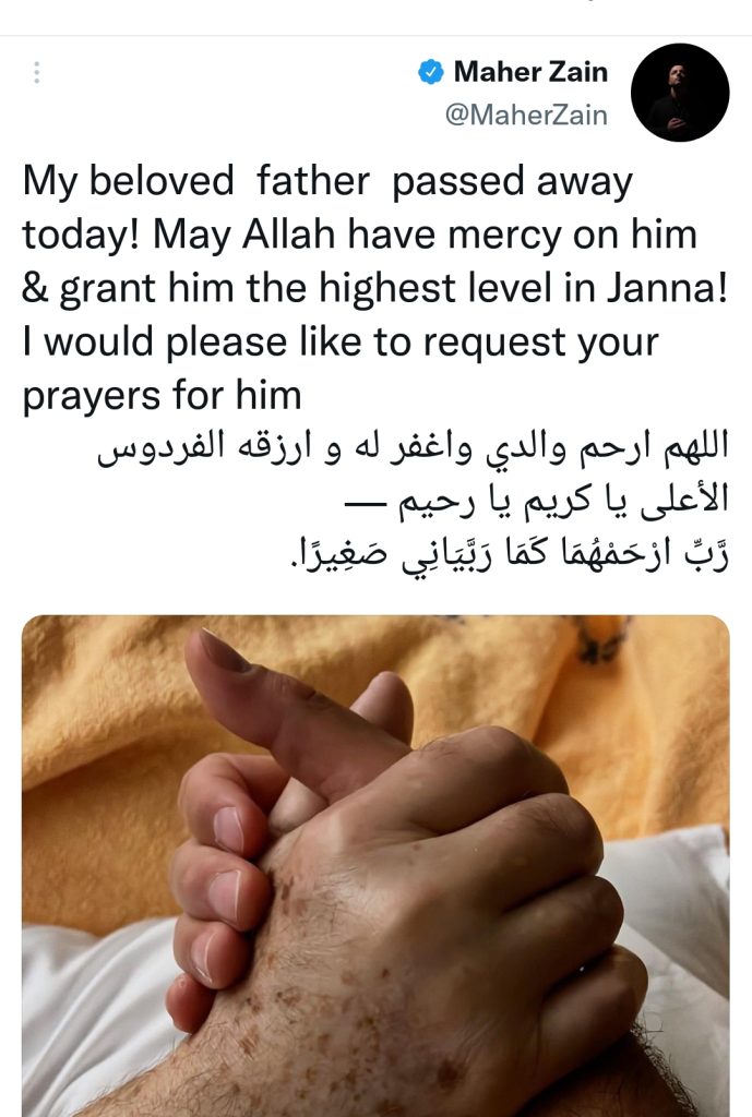 فاجئ الموت المنشد السويدي ذو الاصول اللبنانية ماهر زين , ونشر زين صورة ليده وهي تمسك يد والده عبر حسابه الرسمي على فيسبوك وكتب عليها “إنا لله وإنا إليه راجعون، اللهم ارحم والدي واغفر له وارزقه الفردوس الأعلى يا كريم يا رحيم، رَّبِّ ارْحَمْهُمَا كَمَا رَبَّيَانِي صَغِيرًا، أسألكم الدعاء”.