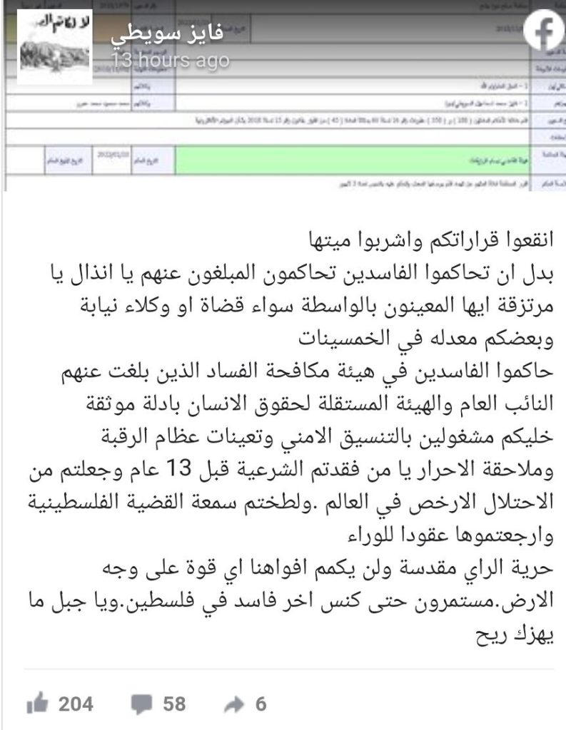وكتب السويطي على صفحته في فيسبوك ردا على قرار المحكمة المسيسة: “انقعوا قراراتكم واشربوا ميتها، بدل أن تحاكموا الفاسدين تحاكمون المبلّغ عنهم يا أنذال يا مرتزقة، أيها المعينون بالواسطة سواء قضاة أو وكلاء نيابة وبعضكم معدله في الخمسينات”.