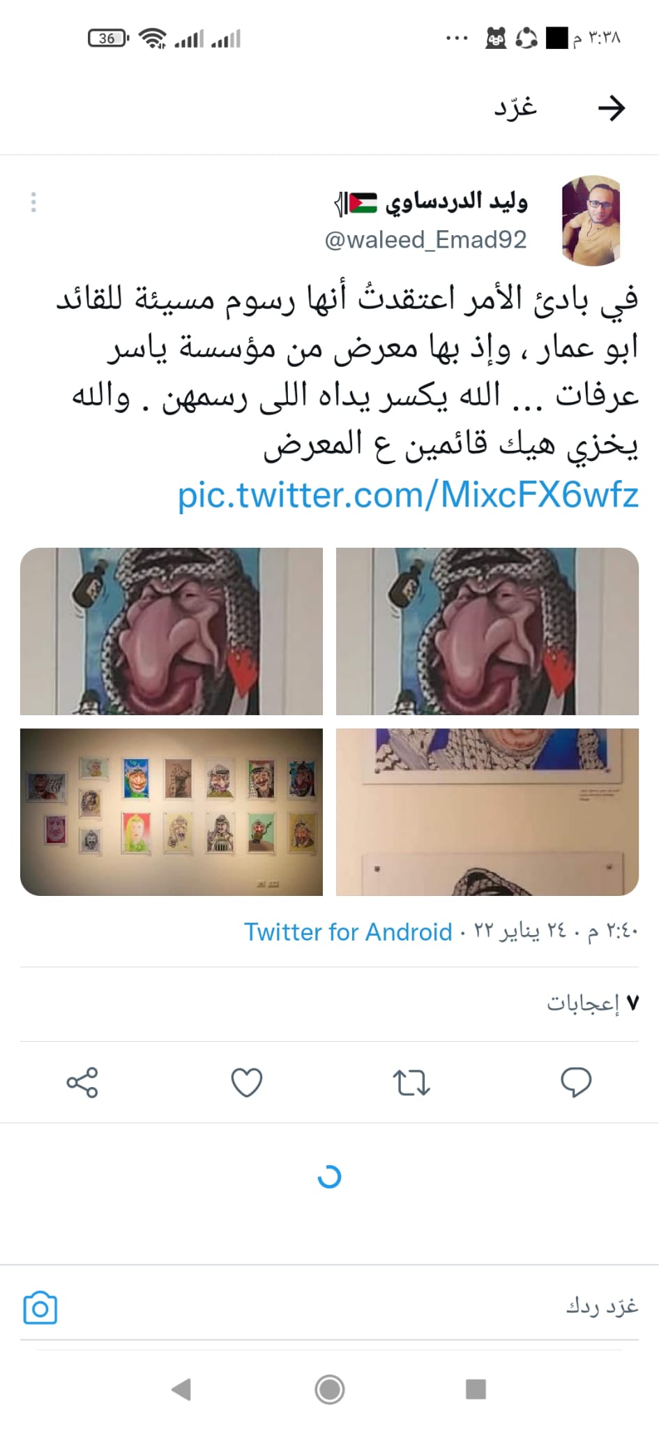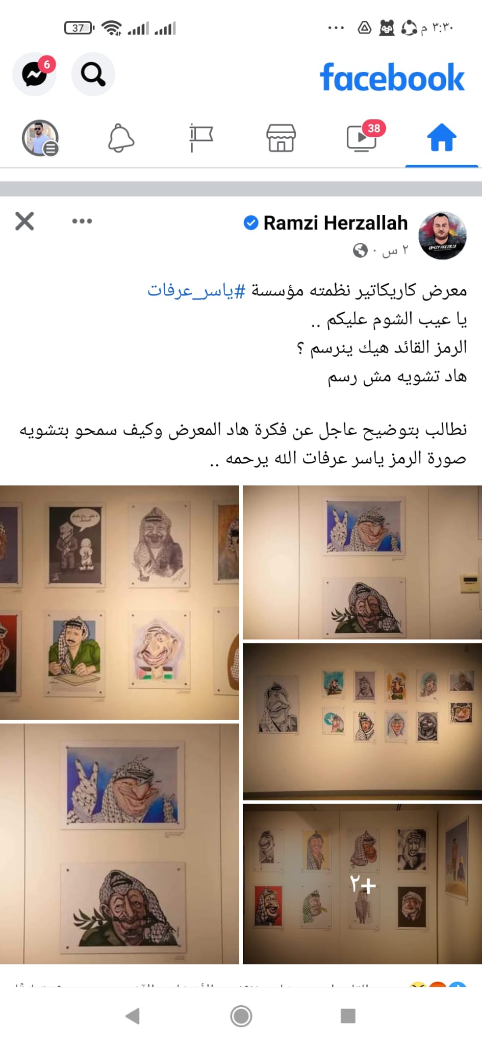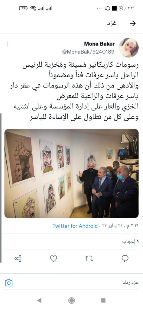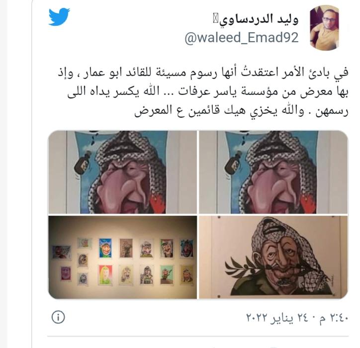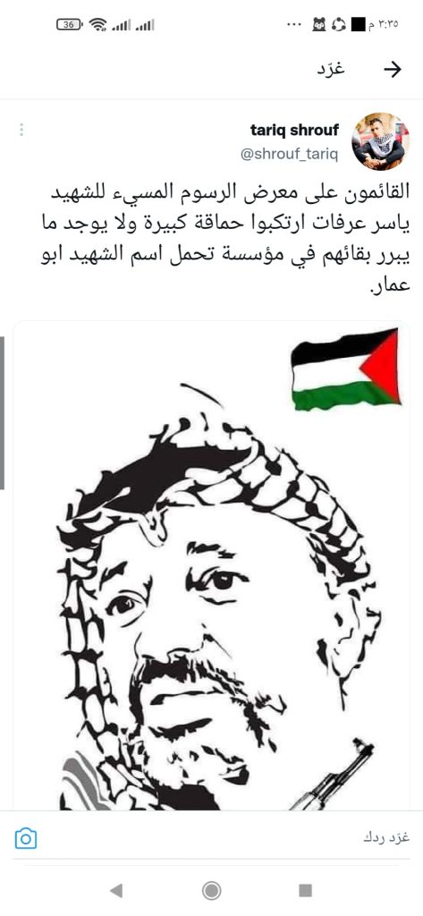 حالة من الغليان والغضب الشديد سادت مواقع التواصل الاجتماعي للنشطاء والمؤثرين بمختلف توجهاتهم بعد تداول الصور المسيئة التي نشرت وشوهدت في تقارير اخبارية رسمية بعد تنظيم مؤسسة الشهيد ياسر عرفات معرض “كاريكاتير” في متحف “أبو عمار” برام الله