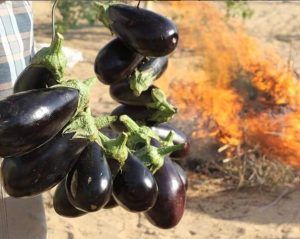 البطيخ الصغير “العجر” الكوسا والباذنجان، والقرع، والفلفل والبندورة والتوم، ويتم شوائهم وعملهم سلطة في اناء كبير يُعرف “باللقان”، أو اللجن