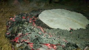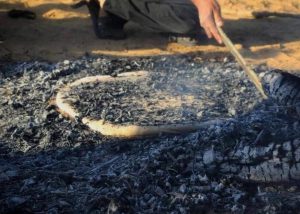 الدقيق والملح، ومن ثم يُعجن ويُدفن في رماد النار حتى ينضج، ومن ثم تقطيعه الى قطع صغيرة.