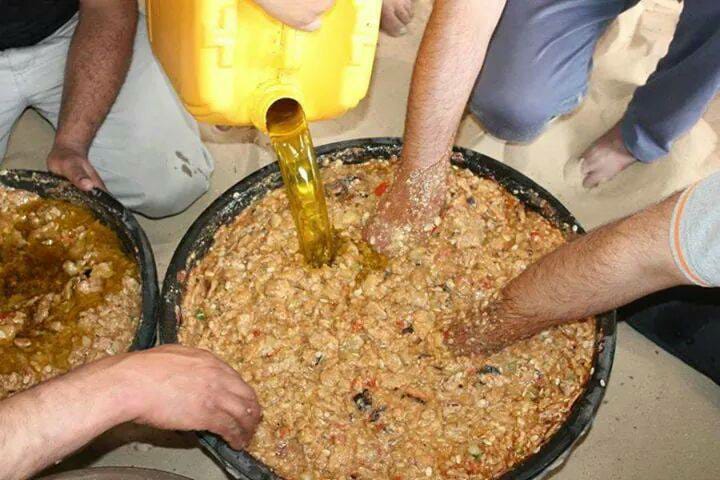 يتم إضافة قطع الخبز أو العجين على الإناء وخلطها جيداً ويضاف لها زيت الزيتون الفلسطيني.