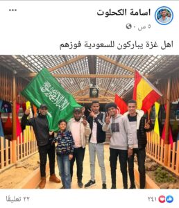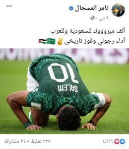 وقد عبّر أبناء الشعب الفلسطيني والنشطاء والصحفييون عن بالغ سعادتهم بفوز السعودية وترجموه من خلال آلالاف المنشورات التفاعلية التي انتشرت كالنار في الهشيم من خلال منصات التواصل الاجتماعي والتي رصدت شبكة “الخامسة للأنباء” عدداً منها