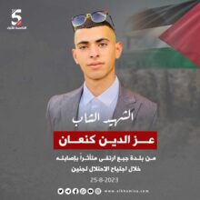 الخامسة للأنباء – جنين استشهد الشاب عز الدين محمود كنعان، (20 عامًا) من بلدة جبع، مساء اليوم الجمعة، متأثراً بإصابته…