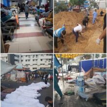 شبكة الخامسة للأنباء _غزة حفر قبر جماعي لدفن جثامين الشهداء المنتشرة في ساحات مستشفى الشفاء، بقطاع غزة