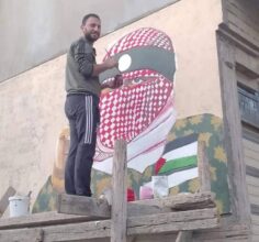 شبكة الخامسة للأنباء _غزة رسم شاب مصري، صورة جدارية لأبي عبيدة الناطق باسم كتائب القسام الجناح العسكري لحركة حماس، في قرية النسايمة بمحافظة…