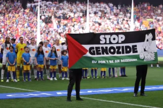 “أوقفوا الإبادة الجماعية”…عبارة كتبت على علم فلسطيني ورُفعت في ملعب إسباني