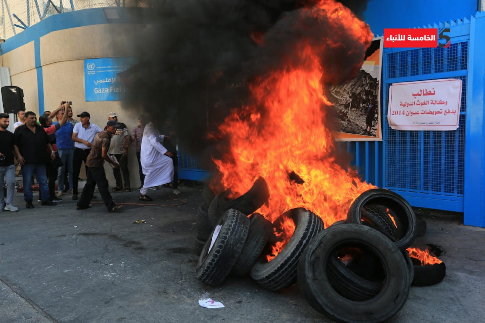 📷محتجون غاضبون يشعلون إطارات السيارات أمام مقر (أونروا) بمدينة غزة