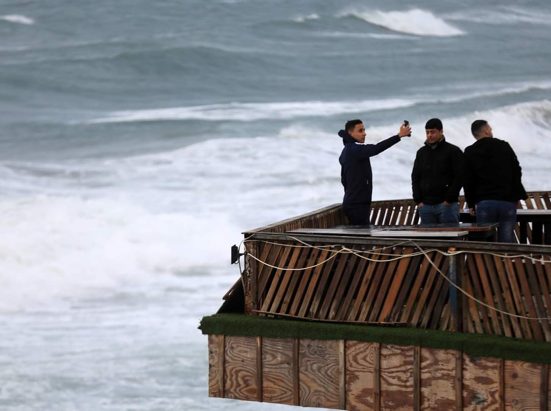 📷 جنون بعض الشبان في الخروج الي شاطئ بحر غزة رغم الجو العاصف