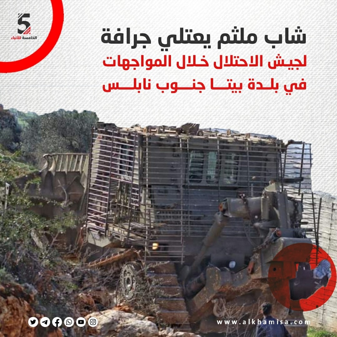 شاب ملثم يعتلي جرافة لجيش الاحتلال خلال المواجهات في بلدة بيتا