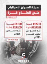 شبكة الخامسة للأنباء _غزة قالت وزارة الصحة الفلسطينية بأن حصيلة عدوان الاحتلال المتواصل على قطاع غزة منذ السابع من تشرين…