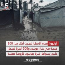 اونروا: مياه الامطار غمرت اكثر من ١٠٠ خيمة في خانيونس و٥٠٠ اسرة تعيش على سواحل غزة يعانون ظروف صعبة