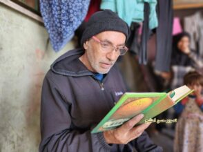 نازحون يتلون القرآن الكريم في أحد مراكز الإيواء خلال أول أيام شهر رمضان الفضيل