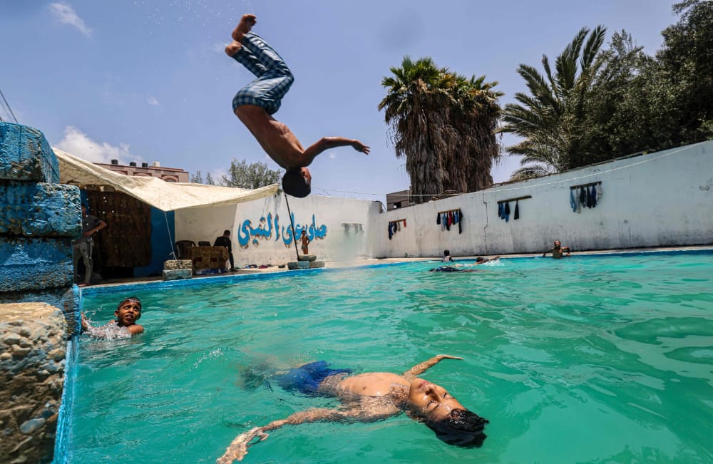 📷أطفال غزة يمارسون هواية السباحة في ظل الأجواء الحارة