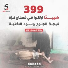 وزارة الصحة : 399 شهيد ارتقوا في قطاع غزة نتيجة الجوع وسوء التغذية